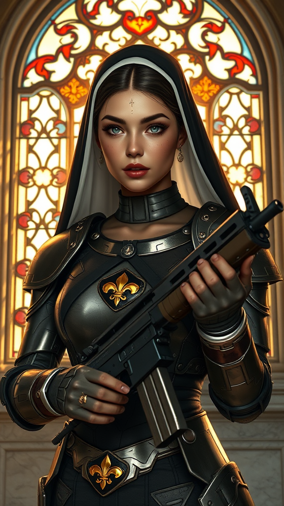 A full body portrait of an enchanting woman who epitomizes beauty, dressed as a sister of battle clad in sci-fi nun armor, holding a bolt rifle. She stands poised in front of an ornate stained glass window. Her tanned skin is adorned with a delicate fleur de lys face tattoo and her armor is detailed with wax seals. Her face is symmetrical and striking, with reflective eyes underlined by dark eyebrows and subtle mascara. The scene is infused with intricate lighting, incorporating dramatic rim and chiaroscuro effects, casting a warm, ethereal glow across her features. The setting evokes a sense of majesty and mystery, with marble walls and drifting dust particles catching the light. This image is crafted as a professional, majestic oil painting, drawing inspiration from the styles of Waterhouse, John Constable, Ed Blinkey, and Jeremy Mann, among others. The piece is detailed and dramatic, aligning with the aesthetics of impressionism and trending on platforms like ArtStation and CGSociety, and reflects influences from Studio Ghibli and Makoto Shinkai's Kyoto style.
