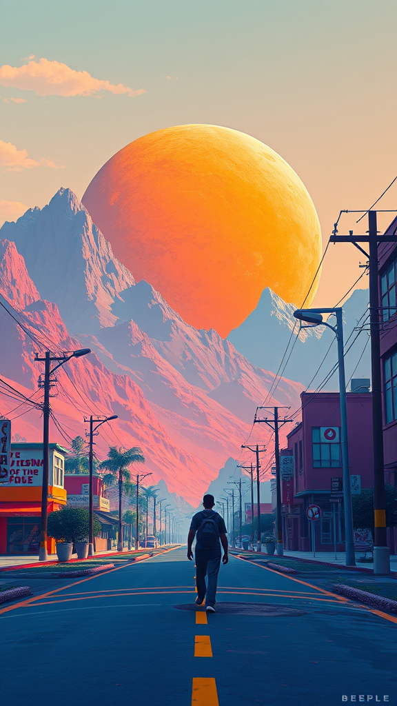 A lone figure walks down a vibrant street, framed by towering mountains in the distance. Inspired by Beeple, this digital art piece captures a surreal landscape featuring a vivid orange planet and a colossal moon. Rendered in detailed low-poly style, it showcases a kaleidoscope of colors and geometric shapes. Amidst this artistry, subtle glitches appear: text overlays, missing or extra digits, and distorted anatomy. The scene is slightly off-kilter, with certain elements cropped, blurred, or oddly textured, giving it an otherworldly, almost unsettling vibe. Watermarks and artifact traces suggest a raw, unrefined aesthetic, adding to the piece's post-apocalyptic beauty.