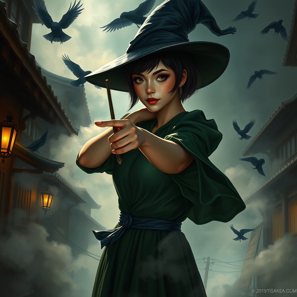 A full body portrait of the most powerful witch in the world, a beautiful woman with short hair, aiming her wand as she casts a spell, walking purposefully towards the viewer. Her reflective eyes and artful makeup highlight her striking features, including a cute nose. Fog swirls around her, accentuated by rim lighting and dramatic chiaroscuro, which add depth and mystery. She wears a green dress with puffy sleeves, fitting for the gothic Victorian town setting, with crows circling above. The style is a professional majestic impressionism oil painting inspired by masters like Waterhouse, John Constable, Ed Blinkey, Atey Ghailan, Jeremy Mann, Greg Manchess, and Antonio Moro, capturing intricate detail and high drama. The scene is reminiscent of Makoto Shinkai's Kyoto landscapes, making it a trending piece on ArtStation and CGSociety, yet with a unique flair.