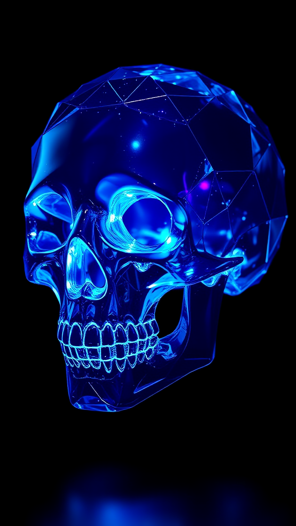 A hyper-realistic 3D rendering of a glass skull with intricate facets, illuminated by an ethereal blue light that permeates through its translucent form. The skull emits a mesmerizing glow against a pitch-black backdrop, enhancing its mysterious and otherworldly appearance. Rendered with the advanced Octane engine, the image captures stunning details and reflections, giving it a sleek, sci-fi ambiance. Subtle hints of violet and turquoise shimmer within the glass, adding depth and complexity to the luminous spectacle.