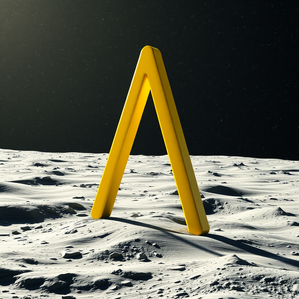 A yellow letter V stands majestically on the moon's surface with a breathtaking, ultra-realistic 3D render. The infinite expanse of space forms a stunning backdrop, dotted with distant stars. The cinematic lighting casts dramatic shadows and highlights the textures of the lunar landscape, giving a high-detail portrayal of this surreal scene. The letter's sleek and glossy finish reflects subtle hints of the starry sky, adding depth to the composition. The serene yet awe-inspiring atmosphere captures the essence of cosmic exploration and discovery.