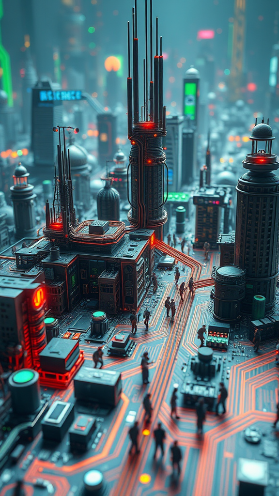 A hyperrealistic depiction of a bustling microscopic metropolis thriving on a circuit board, showcasing tiny dwellers interacting with the intricate pathways and towering components, 8k resolution, vivid details highlighting the vibrant energy of this electric ecosystem, with a touch of sci-fi elements.