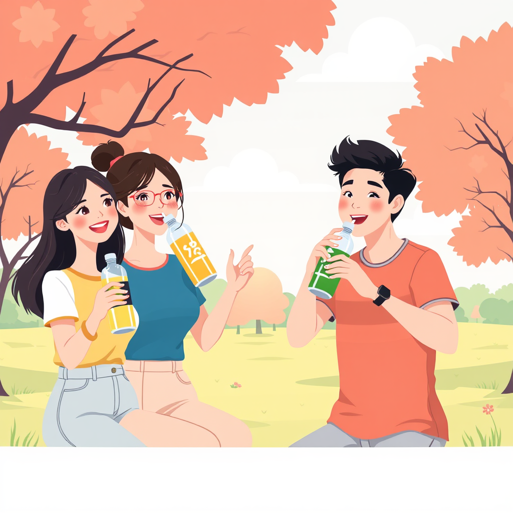 Flat illustration featuring two Asian women and one Asian man joyfully sipping beverages from PET bottles. The characters are positioned in the bottom left corner of the image, set against a vibrant and expansive background that highlights a sunny park scene. The design is in a clean and minimalist vector style, with crisp lines and bold, cheerful colors. High resolution and intricate details emphasize their expressions and the subtle patterns on their casual attire. The scene conveys a sense of friendship and leisure in an inviting and modern aesthetic.