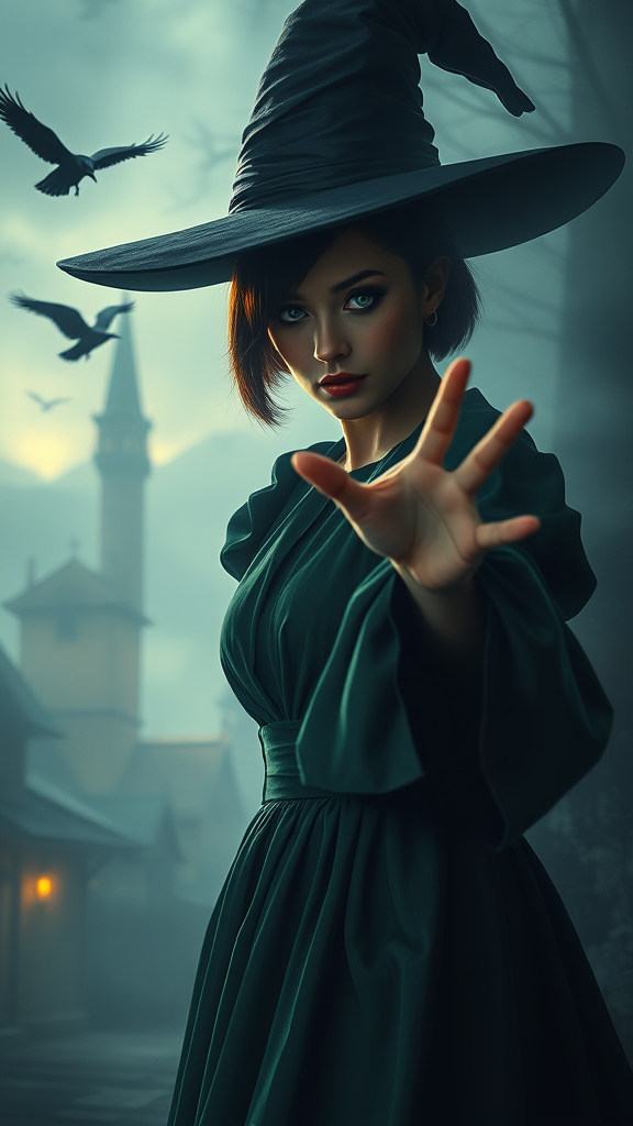 Full body portrait of the most powerful witch in the world, a beautiful witch woman casting a spell while walking towards the camera. She has short hair and stunning reflective eyes accented with mascara and makeup. Her cute nose peeks out from the misty environment, shrouded in fog. Rim lighting and dramatic chiaroscuro highlight her features and the puffy sleeves of her green dress. In the background, a gothic Victorian town is subtly visible, with crows soaring through the skies. The setting captures the essence of a professional, majestic impressionism oil painting by masters like Waterhouse, John Constable, Ed Blinkey, and Atey Ghailan, infused with influences from Jeremy Mann, Greg Manchess, and Antonio Moro. The scene is intricately detailed, capturing a dramatic and awe-inspiring atmosphere. Itβs a blend of trending styles seen on ArtStation and CGSociety, infused with the cinematic charm of Makoto Shinkai's Kyoto-inspired landscapes.