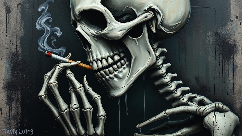 Acrylic painting, utilizing splatter and drip painting techniques, features a portrait of a skeleton holding a cigarette. The side view captures a gloomy and epic composition with dramatic flair, embodying expressionism and emotional depth. The digital painting focuses on a close-up, inspired by Tanya Shatseva's style, conveying a sense of morbid fascination. The character is depicted with intentionally distorted proportions, with elements such as poorly drawn hands and a face, mutation and deformation, emphasizing a blurry and dehydrated appearance. The skeletal figure carries a theme of bad anatomy, with attributes like a long neck, extra or missing limbs, and unsettling proportions. Despite the imperfections and low quality, the piece holds an eerie beauty. The painting is marred with jpeg artifacts, and decorative elements like names, signatures, and watermarks subtly blend into the background, enhancing the chaotic and grotesque aspects.