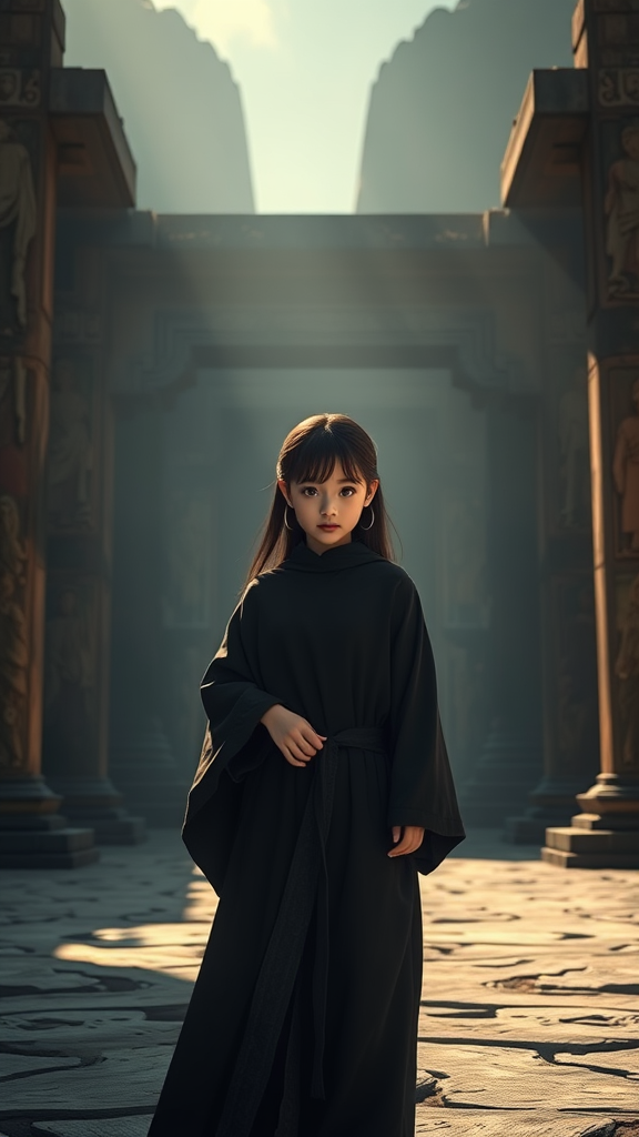 A single girl in dark flowing robes stands against the backdrop of an ancient temple, her symmetrical eyes glinting with intelligence and curiosity. The scene is enveloped in dramatic lighting that casts sharp shadows, enhancing the realistic and intricate details of the environment. The focus is razor-sharp, capturing the essence of hyperrealism through photography techniques like raytracing and physics-based rendering. Her dynamic pose adds life to the image, blending elements of 3D CGI with the timeless charm of anime and digital illustration. This digital artwork draws on the sophistication of a highly complex, HD composition that balances realism with the expressive creativity found in digital painting.