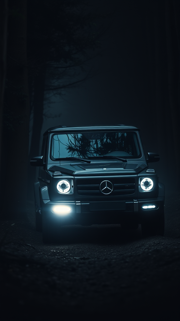 A Mercedes-Benz G-Class SUV navigates through a dense forest with headlights piercing the dim surroundings, capturing the essence of dark modernism. The scene is urban-inspired with a 32k UHD resolution that highlights the moody atmosphere and professionally color-graded nuances, enhanced by atmospheric lighting that casts intriguing shadows and textures. The composition evokes a sense of adventure and mystery with its sleek design harmonizing with the rugged, natural landscape.