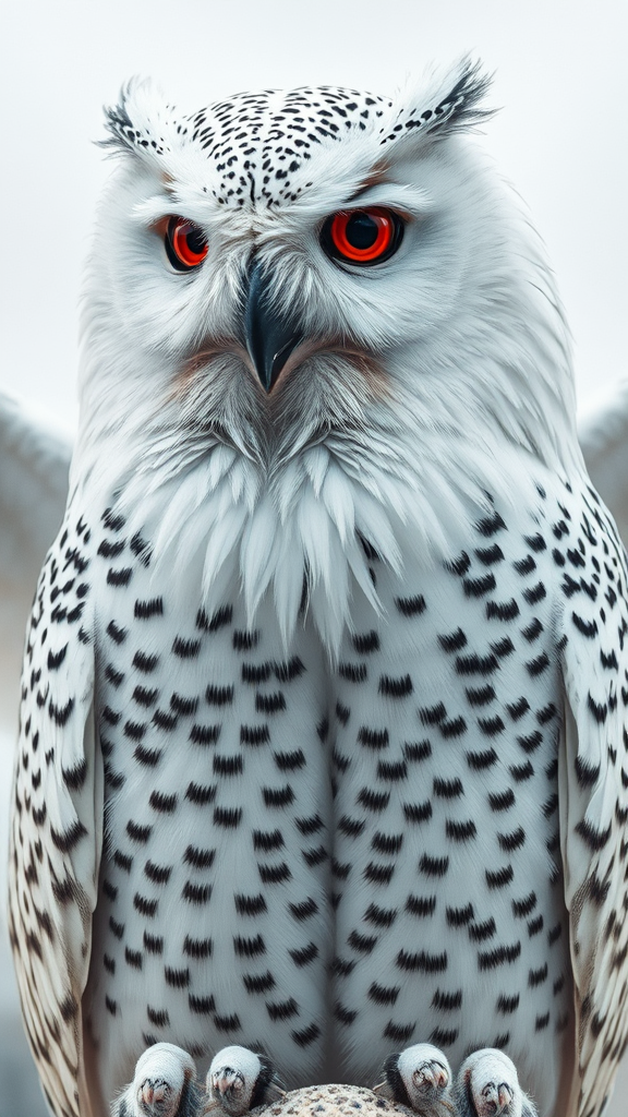 mdjrny-v4 style, high resolution portrait of a snowy owl with an artistic twist, inspired by Marta Bevacqua and Guy Aroch, Peter Coulson aesthetics, featuring a surreal CGI feel, blending realistic textures and doll-like features. The owl displays striking red eyes and a captivating airbrushed appearance. The composition includes abstract elements: multiple wings, exaggerated feathers, and unusual anatomy. Some features are intentionally blurred and fuzzy to create a dreamlike atmosphere, with occasional disfigured patterns suggesting tiling and mutation, while maintaining an enigmatic, out-of-frame allure. The owl's expression and environment evoke a sense of mystery and intrigue.