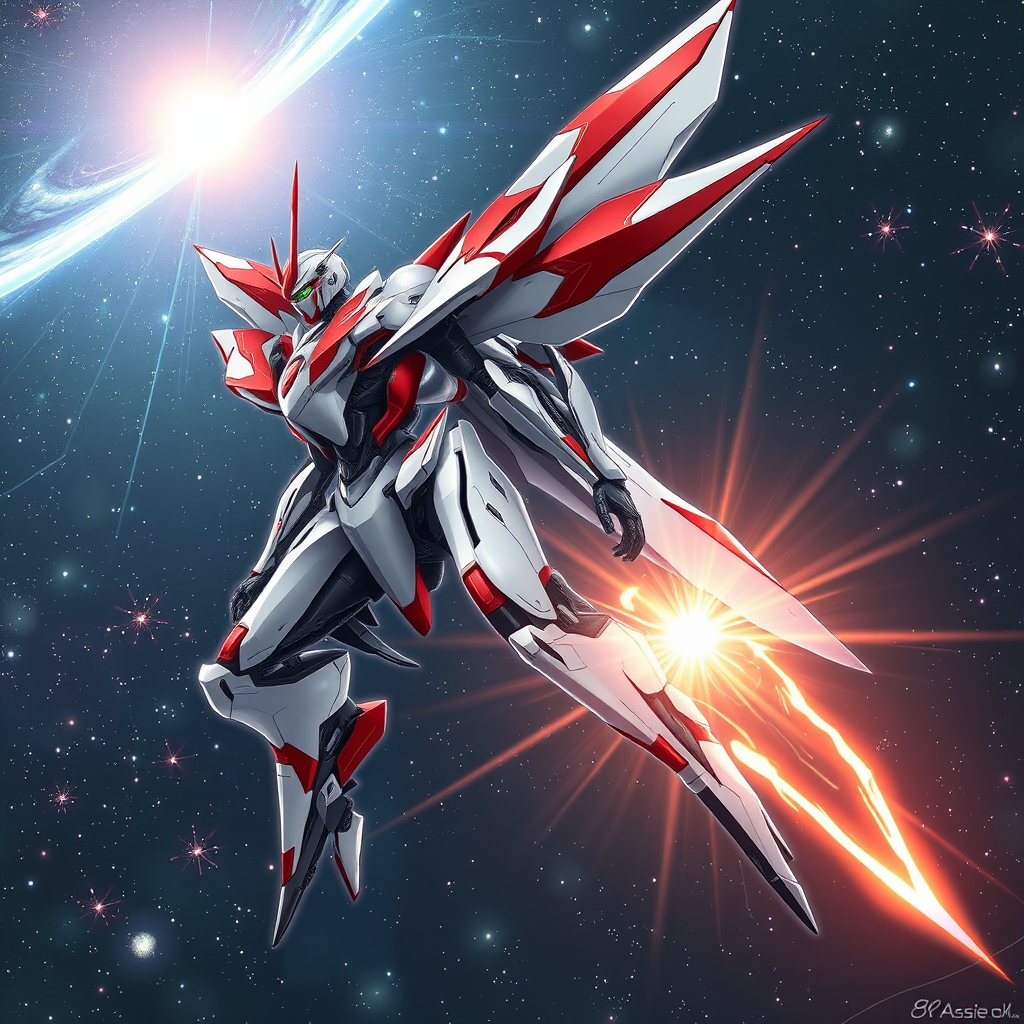 Portrait of a sleek and streamlined sci-fi mech, featuring a slender insectoid-inspired design with a fighting stance. The mech's glossy white and red surface gleams with intricate details, showcasing sci-fi wings and an insectoid style. The artistic influence is drawn from Tsutomu Nihei and Akira, set against a vivid space backdrop where a bright quasar dominates the scene. The surroundings are a dramatic expanse of outer space, speckled with stars and glowing quasars, enhanced by powerful beams and a dynamic plasma blast wave. This depiction is rendered in 8k UHD with anime and manga influences, achieving hyper-realistic effects through complex lighting and a bright flash, encapsulating the essence of futuristic anime art.