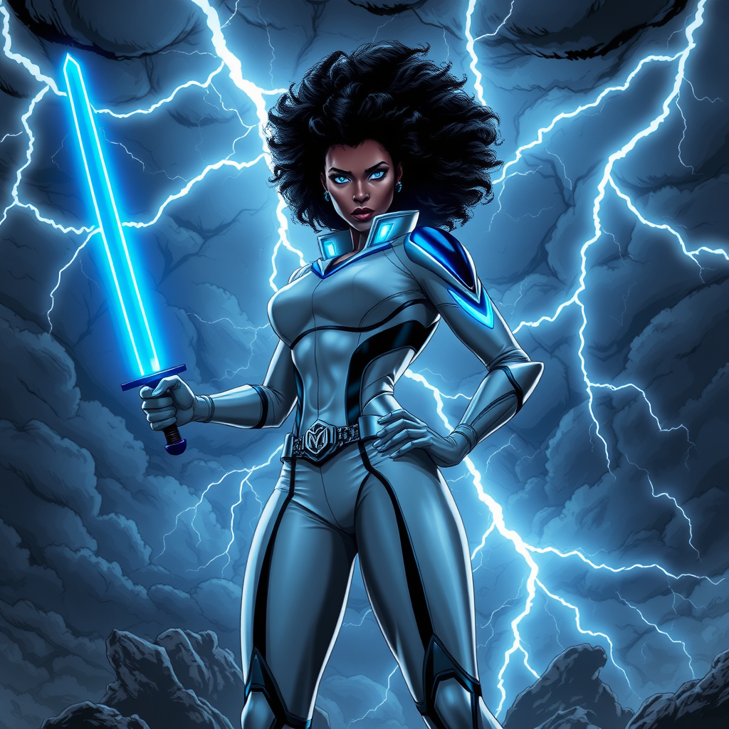 An awe-inspiring female superhero stands defiantly against a tempestuous backdrop, her silhouette illuminated by the jagged arcs of lightning branching through the turbulent sky. Clutched in her right hand, a sword gleams with an ethereal blue light, while her left hand is poised towards the heavens, fingers splayed as if commanding the storm itself. Her attire is sleek and futuristic, predominantly white with vibrant blue accents that reflect the electrical storm's brilliance. Her hair, a magnificent afro, frames her determined, fierce expression, embodying the raw power and resilience she channels. The churning dark clouds and relentless lightning strikes amplify the scene's intensity, crafting an atmosphere charged with drama and energy, evoking an epic visual narrative fit for a groundbreaking graphic novel.