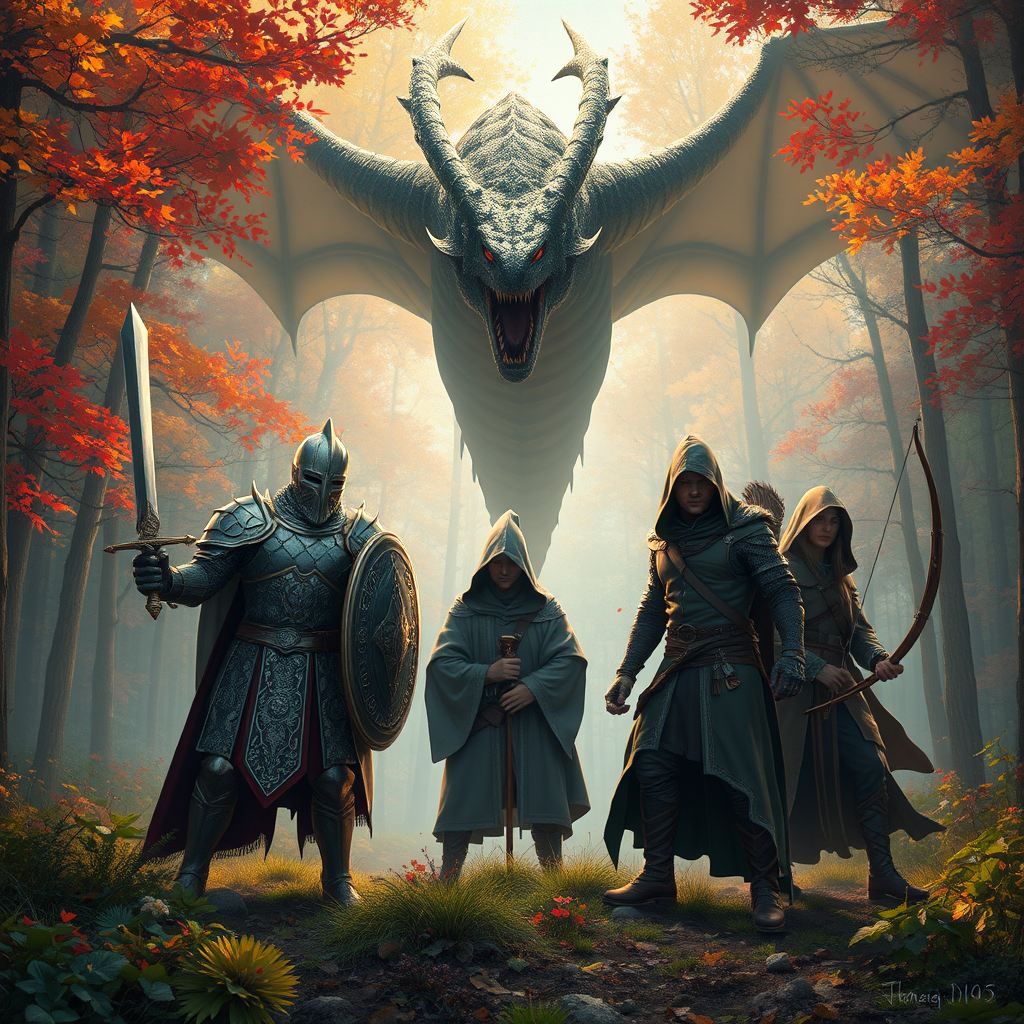 A breathtaking image of an epic fantasy battle unfolds in a forest painted with a harmonious blend of vibrant and subdued hues. At the forefront stands a paladin, clad in intricately detailed armor, gripping a subtly radiant sword and a gleaming shield. Flanking the paladin is a wizard, their presence shrouded in mystery by a hooded robe decorated with elaborate arcane symbols. The wizard's staff, crowned with a softly glowing orb, hints at arcane power within. On the other side, a skilled ranger, clad in a beautifully detailed leather cloak, holds a longbow poised and ready for the encounter. The trio stands united against a colossal, three-headed dragon, its scales shimmering in muted tones, each head expressing a different ferocity. The forest scene is alive with sharp and clear natural light, revealing every crisp detail of the characters and their vibrant setting. This scene is brought to life with subtle creative enhancements, maintaining its core essence of adventure and mystique.