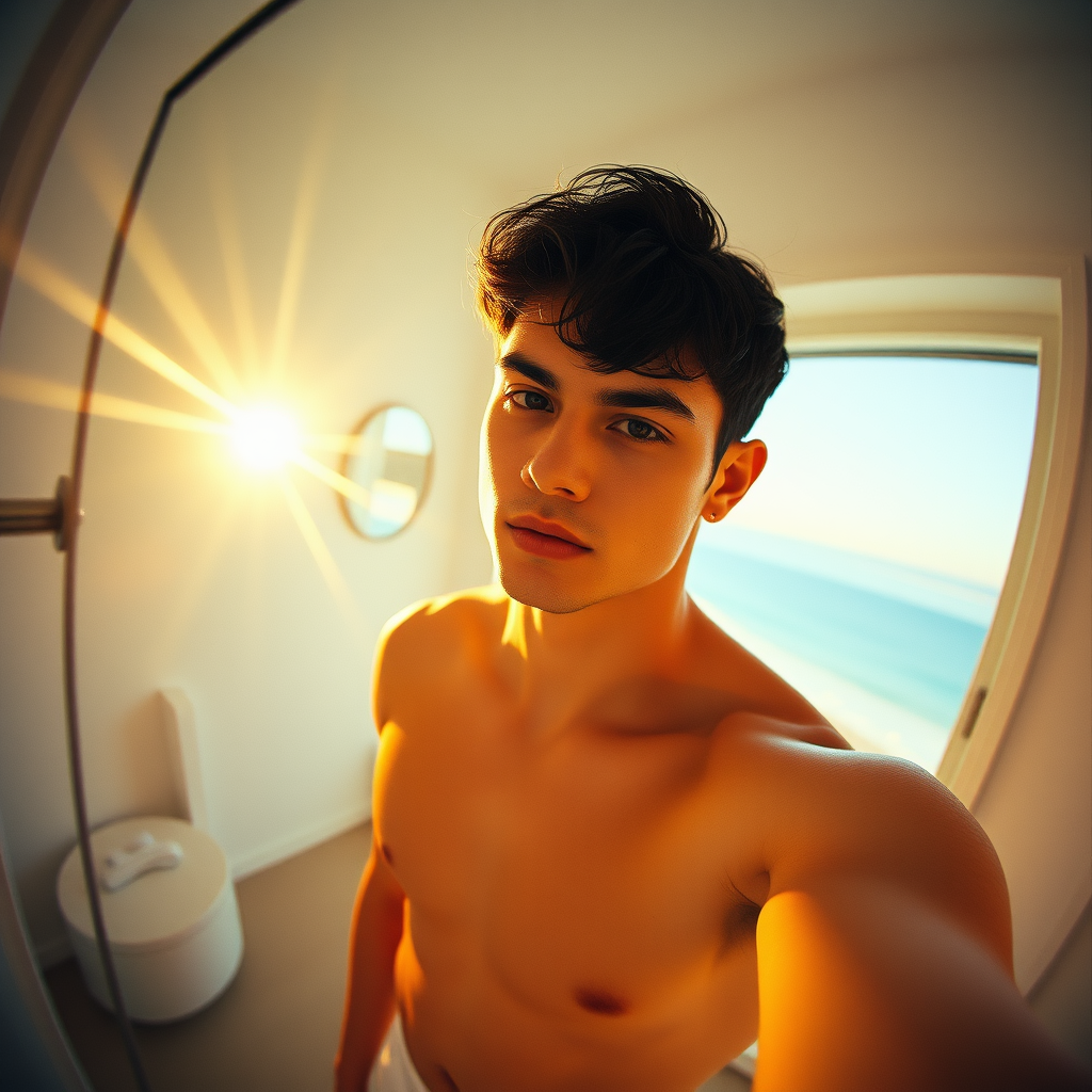 Full angle view, hyper-realistic image, attractive man in stylish beachwear, ray tracing effect, perfect lighting, captured on iPhone 14 in a sleek mirror, short dark hair, inviting bright room ambience, subtle film grain, shot with Kodak Portra 800 at f1.8, capturing the warm essence of golden hour.
