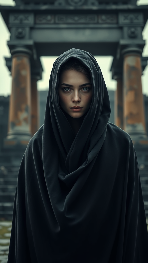A solitary figure of a young woman draped in dark, flowing robes stands prominently against the backdrop of an ancient temple. Her eyes are symmetrically captivating, highlighted by dramatic lighting that enhances the scene's realism. The image is captured with sharp focus, in HD, showcasing highly complex and intricate details. This hyperrealistic portrait, utilizing advanced raytracing and physics-based rendering, presents an ultra-high-resolution visual experience. The composition maintains high detail, embodying the essence of a RAW color photo. It offers a seamless blend of CG and photography, encapsulating the essence of 8K quality—a masterpiece devoid of imperfections, emphasizing perfect anatomy, proportions, and clarity, while maintaining a high artistic value.