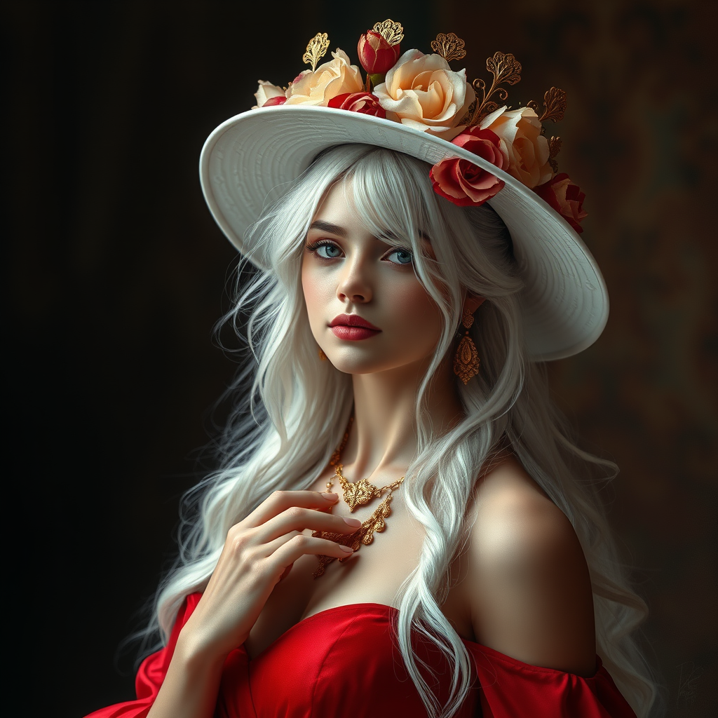 A stunning digital painting captures a woman with ethereal white hair, gracefully wearing an elegant red dress and a white hat adorned with exquisite gold details that highlight her face. Her captivating presence is enhanced by an intricate crown of flowers, beautifully arranged, and she holds delicate golden filigree ornaments at her neckline. The background evokes a sense of dark fantasy, suited for a fashion magazine cover, showcasing award-winning lighting that is both dramatic and hyper-realistic. The scene is captured in ultra-high resolution, with photo-realistic details reminiscent of oil paint splashes. This artwork combines elements inspired by Gaston Bussiere, Rutkowski, Mucha, Greg Hildebrandt, Tim Burton, Ivan Albright, Michael Whelan, Paul Klee, WLOP, Lisa Frank, Rene Magritte, Gustav Dore, and other renowned artists, creating a harmonious blend of styles. It reflects a hyper-detailed, atmospheric portrait that embodies the essence of a divine goddess, with cinematic and photorealistic elements that engage the viewer in a mesmerizing visual experience.