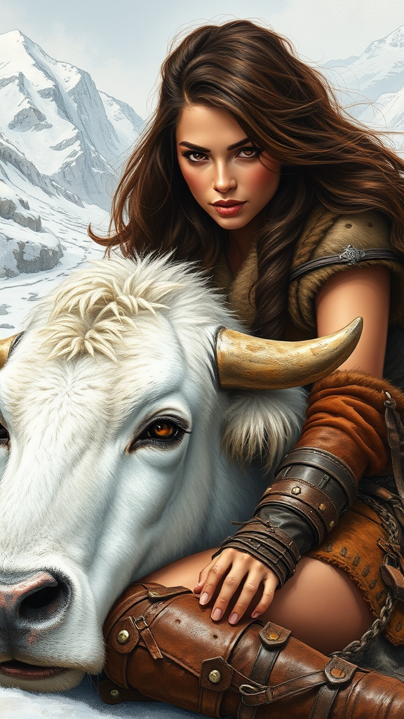 Stunning color sketch of a powerful and captivating barbarian warrioress with intense brown eyes and long, flowing dark brown sable hair, peacefully resting beside her massive white war yak. Her skin is sun-kissed, and she is clad in rugged brown leather and fur armor, complete with sturdy boots. In the background, a snowy mountain path is sketched, setting an adventurous scene. The lighting is dynamic and volumetric, creating a hyperrealistic, photorealistic, and hyperdetailed maximalist masterpiece. Emphasizing a dark romance fantasy atmosphere, the piece avoids any visual flaws, maintaining perfect anatomy and composition without any artifacts or distortions.