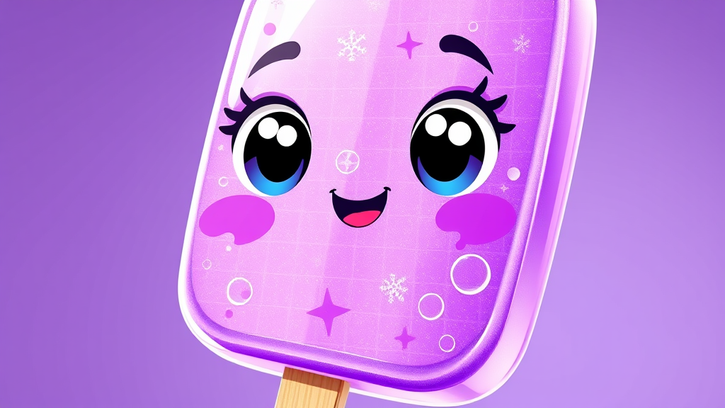 A hyper-realistic, 5k render of a cute popsicle character from a mobile game, featuring a vibrant purple hue with a glossy, toon-inspired finish; the character has friendly, wide eyes and a playful expression, with a slight sparkle reflecting in its icy surface; the popsicle is adorned with whimsical patterns and gentle shading that accentuates its contours, adding a touch of charm and personality to this sweet, lovable creation.