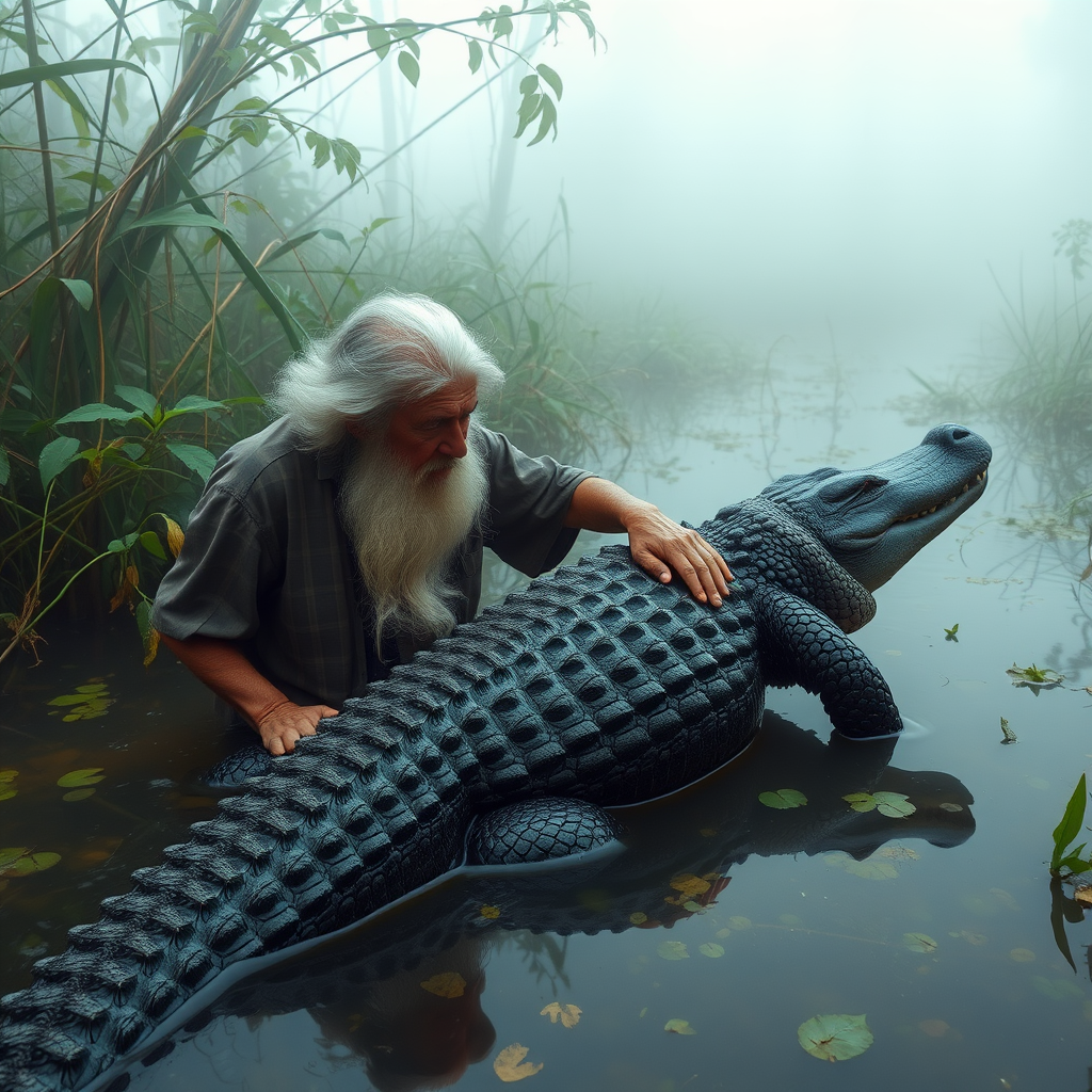 In a misty swamp, an elderly man with a flowing white beard gently strokes the scaly back of his alligator companion, the two sharing a moment of serenity amidst the lush, tangled greenery.