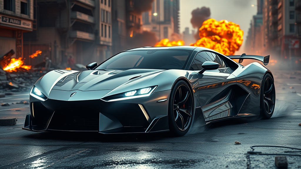 Hyper-realistic futuristic muscle car with a sleek, aerodynamic design, a combination of bright aluminum and matte black bodywork, piercing LED headlights cutting through the darkness, captured in high resolution, with a background of a dystopian city crumbling amidst explosions, creating a sense of urgency and velocity. Ultra detailed, with ray-traced reflections glistening on the car's surface, beautifully capturing specular lights, all presented without a frontal angle, emphasizing its powerful silhouette against the chaotic urban landscape.