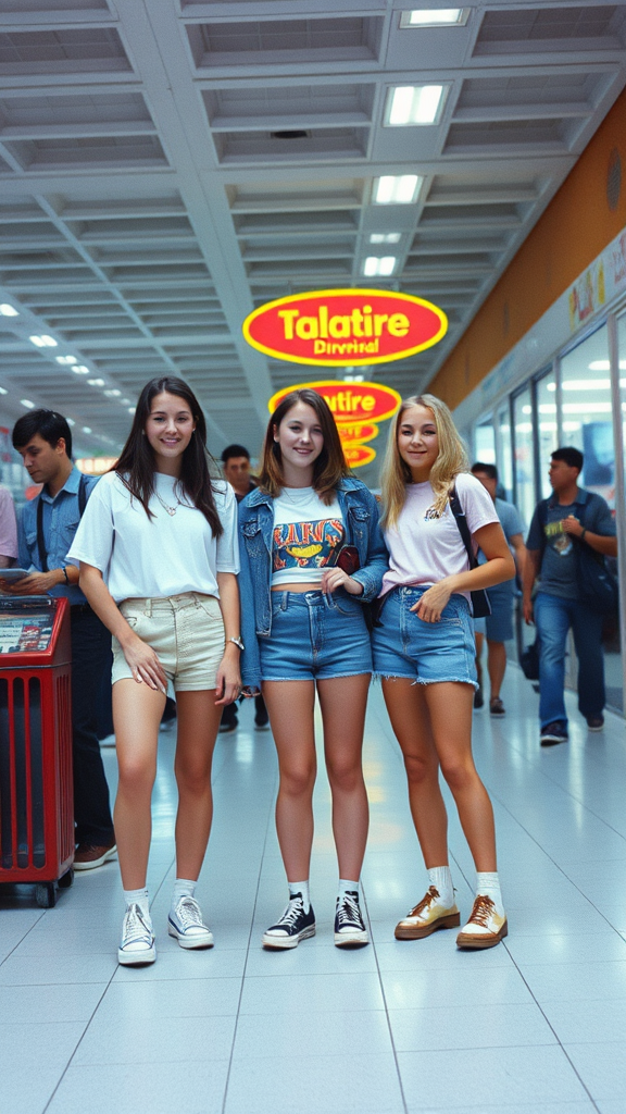 Quirky snapshots of 90’s mall teenagers decked out in vintage outfits, captured through the nostalgic lens of a VHS camcorder, complete with vibrant colors and nostalgic imperfections.