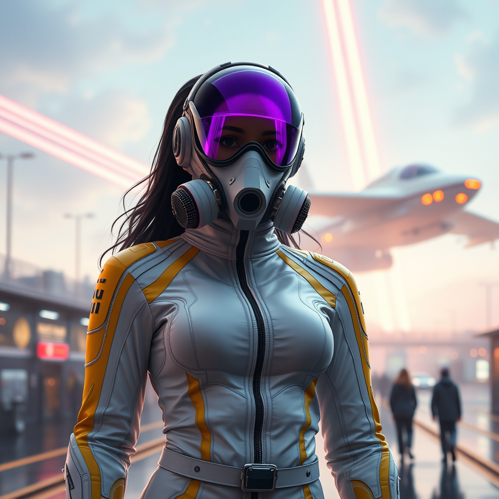 A striking female figure stands confidently in a sleek white and yellow detailed jumpsuit, surrounded by the bustling environment of a futuristic spaceport. Behind her, a massive ship takes off, leaving trails of vibrant light in the sky. Her face is partially obscured by an intricate mask and a purple sci-fi visor, combining with a high-tech respirator for a truly otherworldly appearance. The scene is filled with extreme detail and cinematic lighting, showcasing a masterpiece of photography with stunning smooth and shiny surfaces. The atmosphere is surreal and divine, reminiscent of celestial sci-fi manga and anime worlds. The environment is rich with color, and the hyperrealistic focus gives a sense of immersion as if rendered in Unreal Engine 5 with impressive lumen reflections. The 3D CGI elements come to life in this near-flawless depiction, avoiding imperfections like low-resolution artifacts, unnatural proportions, or any visual distortions, achieving an awe-inspiring fusion of creativity and technology.
