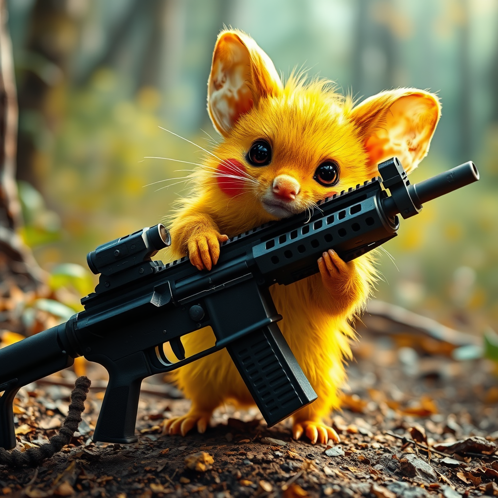 Picture a small, electric creature with bright yellow fur and large, pointed ears, wielding an oversized automatic rifle, causing a curious juxtaposition. Its round, red cheeks flicker with sparks of electricity as it tries to balance the heavy weapon, its eyes focused and determined. The contrast between its adorable, rodent-like appearance and the intimidating firearm creates a scene both whimsical and unexpected, set against a vibrant woodland backdrop where nature's tranquility meets the creature's fierce resolve.