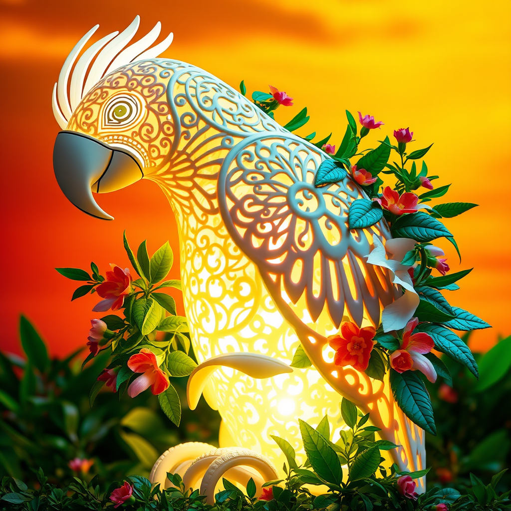 A radiant 3D parrot-shaped sculpture with intricate abstract designs, seamlessly intertwined with lush green foliage and vibrant flowers, emitting a soft, ethereal glow against a warm, sunset orange backdrop.