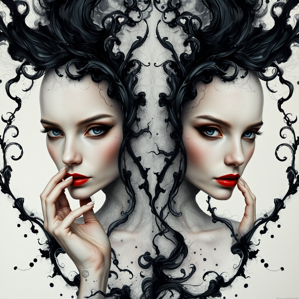 Exquisite woman, Black ink cascade, ultra-high definition resolution, photorealistic marvel by Aaron Horkey and Jeremy Mann, intricately rendered fluid gouache creation by Jean Baptiste, expert photography, natural illumination, soft volumetric lighting, maximalist style, high-resolution concept art, richly detailed, complex, sophisticated, expansive, fantastical, cover design, double portraits, dual expressions, slightly out of frame, unusual features, altered anatomy, abstract hands, imperfect facial structure, unique forms, abstract limbs, blurred focus, unconventional proportions, replicated faces, transformed appearance, slightly obscured, distinctive limbs, imaginative anatomy, exaggerated proportions, artistic limbs, missing elements, additional limbs, artistic hands, overlapping fingers, accentuated fingers, elongated neck, imaginative eyes, dual expressions, twin portraits.