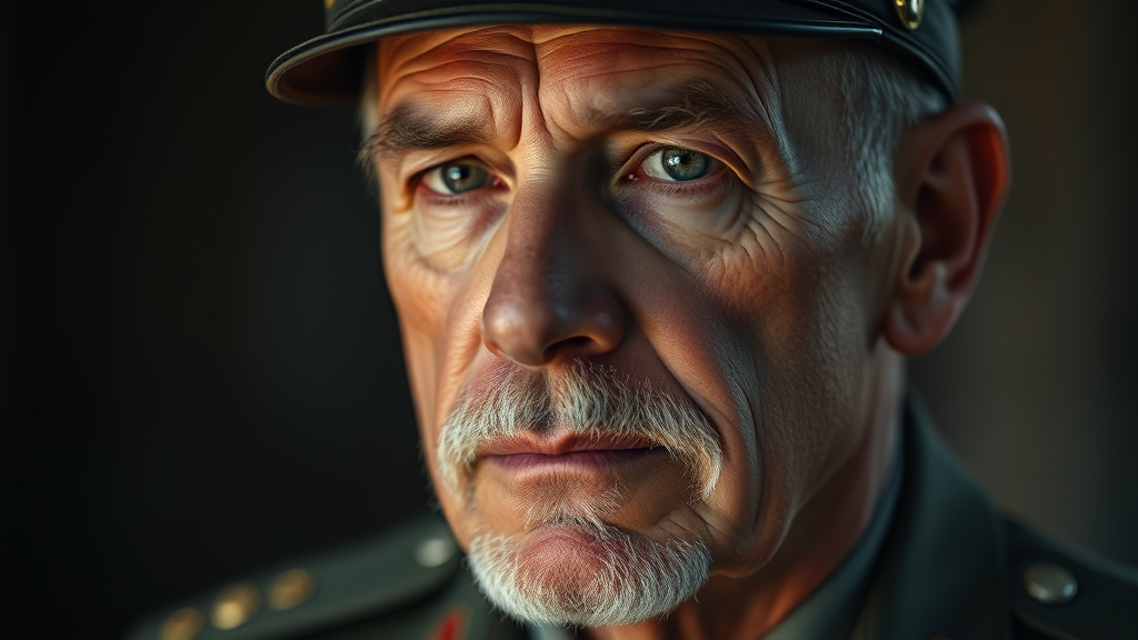 Close-up cinematic portrait of a seasoned 62-year-old decorated general, whose clean-shaven face reflects an aura of resilience and strength. His serious and stoic expression suggests a life of disciplined service, captured in a highly detailed 4k photograph. The shot, rich with texture, is taken on Kodak film, emphasizing the depth and character in his features. The background displays a soft, artful bokeh, casting a dark and moody atmosphere reminiscent of an HBO series, enhancing the epic quality of this distinguished figure.