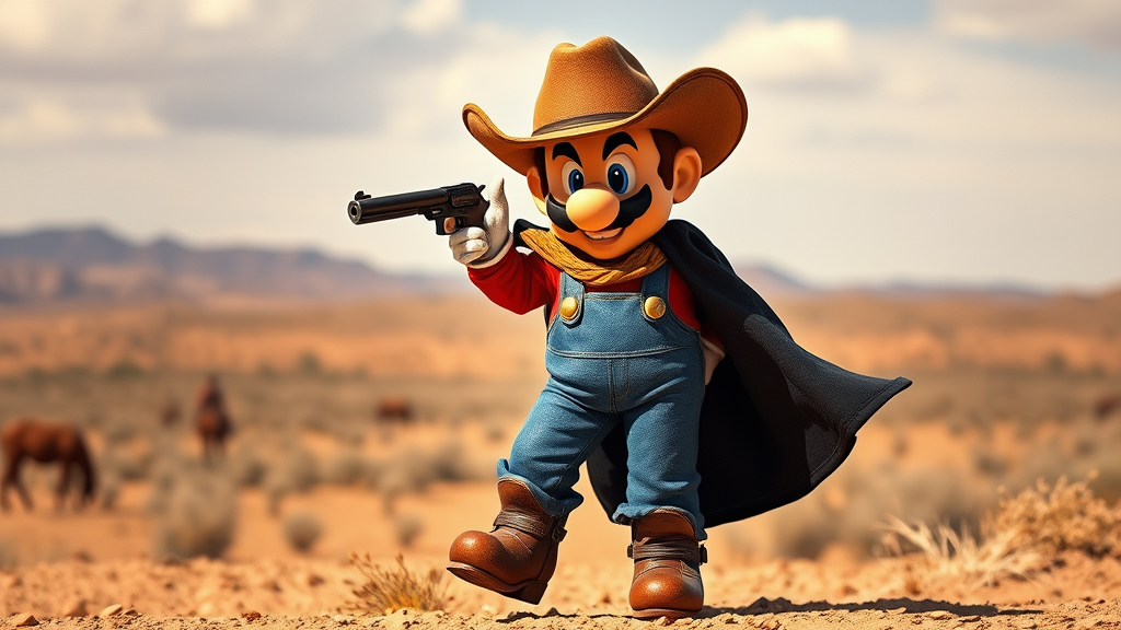 Super Mario transformed into a wild west gunslinger, wearing a rugged poncho draped casually over his shoulder, a wide-brimmed cowboy hat tilted jauntily on his head, and weathered leather boots that crunch the dusty ground with each step. His denim overalls are swapped for a pair of classic cowboy trousers, and a black duster coat flutters behind him in the breeze. His iconic mustache twitches as he surveys the frontier, embodying a fearless outlaw with a playful glint in his eye, captured in a dynamic motion picture shot against the vast, untamed landscape of the wild west.