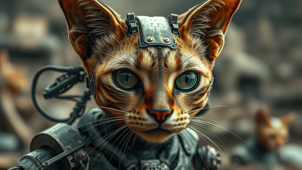 Mechanical cyborg cat, rusty aged armor, ancient metal components, intricate robot design, visible wires and cables, realistic and creepy aesthetic, unsettling and scary presence, apocalyptic backdrop, engaging viewer with an intense gaze, portrait style, detailed skin texture, photo-realistic quality, full-length frame, high detail in RAW colors, striking piercing details, soft diffused lighting, shallow depth of field with sharp focus, cinematic and hyperrealistic lighting, including low-resolution elements and digital imperfections, text elements, low quality with intentional distortions, overlapping and duplicated features, morbid and mutated aspects, blurred and dehydrated appearance, flawed anatomy and proportions, multiple limbs and features, disfigured and malformed characteristics, excessive and fused appendages, elongated neck, and unintended digital artifacts like usernames, watermarks, or signatures.