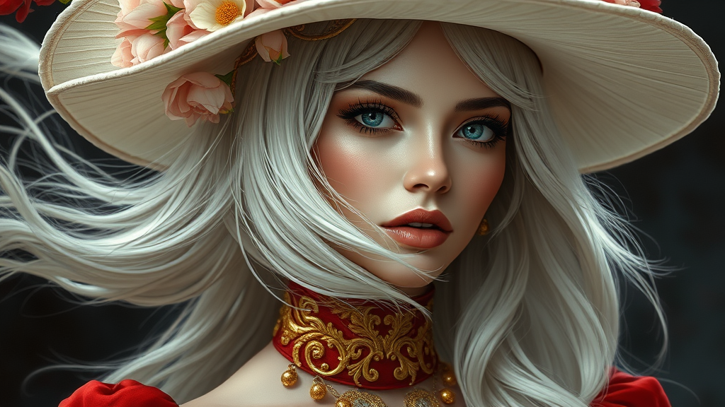 A striking woman with flowing white hair, adorned in a luxurious red dress, elegantly topped with a white hat featuring intricate gold embellishments on her face. This portrait showcases a harmonious blend of the styles of masters like Gaston Bussiere, Rutkowski, and Mucha, with influences from Greg Hildebrandt and Tim Burton. The ethereal beauty is crowned with delicate flowers intertwined with golden filigree ornaments around her neckline. Set against a dark fantasy backdrop, this digital painting captures the essence of a modern goddessesina, with award-winning atmospheric lighting and hyper-realistic detail. Crafted in ultra-high resolution, every aspect of her face is depicted with photorealistic precision, evoking an enchanting, cinematic quality as if designed for a high-fashion magazine cover. The image strikes a balance between realism and fantasy, ensuring the portrayal is both captivating and flawlessly executed.