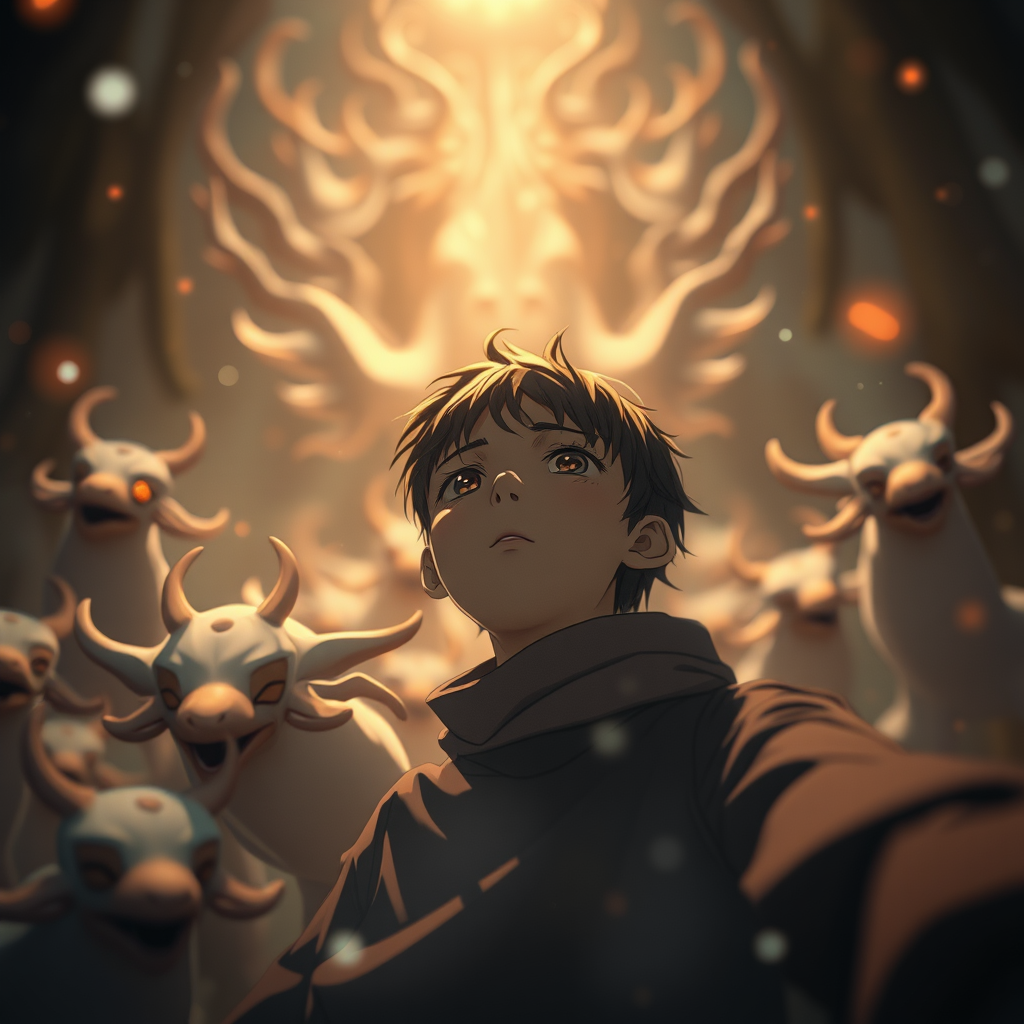 Anime character caught in an ethereal journey with spirits, inspired by Hayao Miyazaki, 8k resolution, hd quality, soft contour lighting, striking high contrast, intricate depth of field, ultra-detailed rendering, photorealistic elements, cinematic approach, sense of gigantism, portrayed from a first-person perspective, rich with narrative details, somber and mysterious atmosphere, bokeh effects lending depth, epic composition, strikingly realistic textures, capturing a world steeped in mythology and wonder, with whispers of magic in the air.
