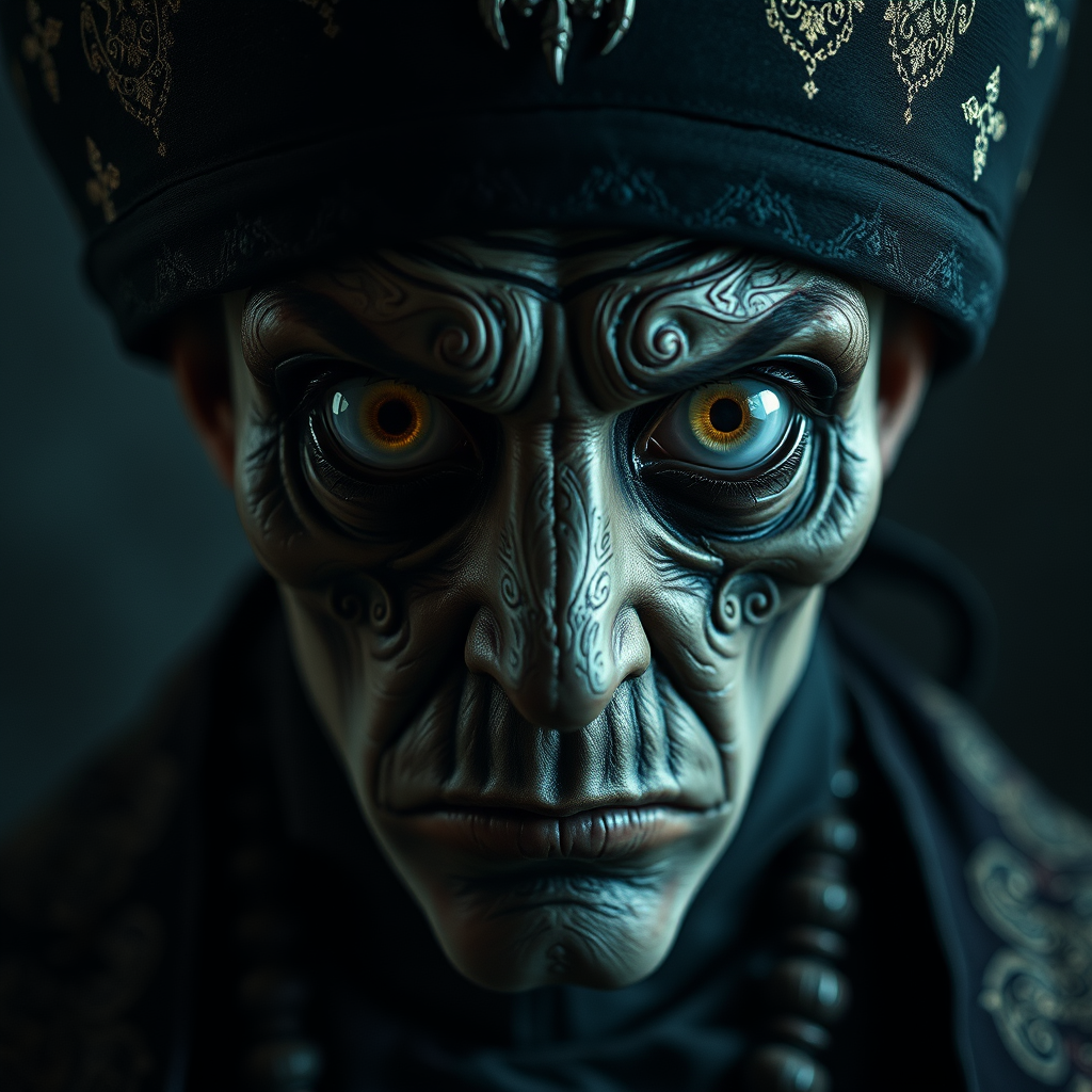 Hyper-realistic from the shadowed realm, featuring eyes that captivate with a story of dread, adorned in garments rich with symbolic and orthodox intricacies, his oversized eyes reflecting a haunting fear, captured with the precision of a Hasselblad H4D 200MS Digital Camera, using a Mitakon Speedmaster 65mm f/1.4 XCD lens, enhanced by the drama of Fresnel lighting.