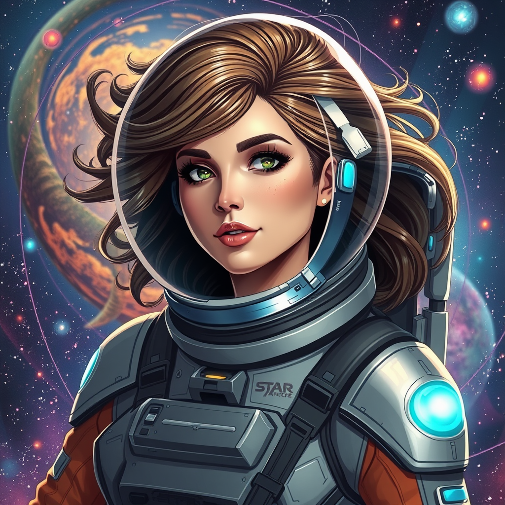 woman in a space suit character portrait space art retro-futuristic armor high detailed official artwork her hair resembling the swirling cosmos fantastic screenshot art hyperrealism dynamic lighting 3d cartoon anime sketches elements vivid colors intricate design ethereal glow exploring cosmic landscapes vibrant starry background radiant nebula hues realistic textures imaginative expression celestial elegance timeless sci-fi charm futuristic technology innovative artistic vision stunning visual depth cosmic wonder