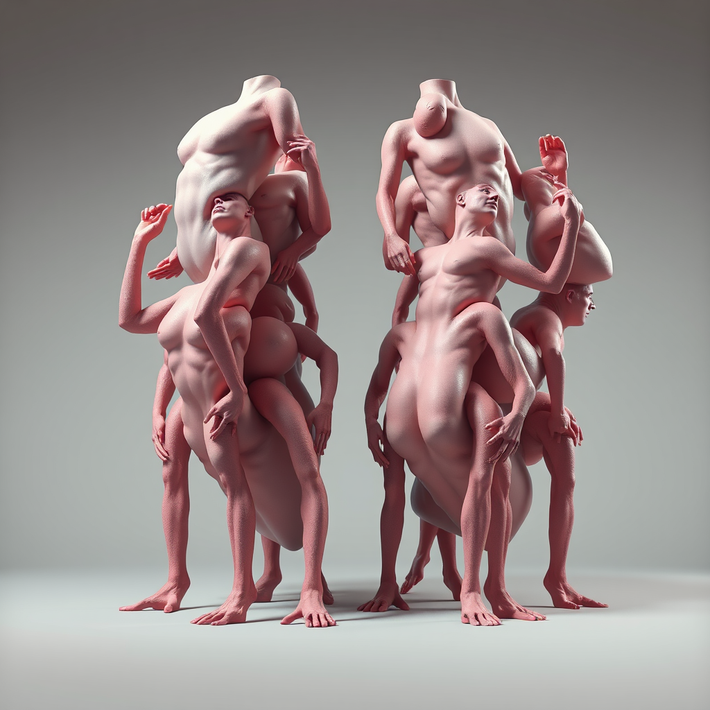 Pixar-inspired scene, featuring pastel color palette, realistic lighting and shading, capturing a dynamic pose with high-quality, ultra-detailed 3D rendering using C4D and Octane Render. Ray tracing enhances the 8k resolution, showcasing a surreal composition of abstract, totem-like stacked torsos. The piece intentionally explores themes of distorted anatomy, featuring unnatural and exaggerated forms with extra and missing limbs, floating and disconnected, evoking a sense of mutation and grotesque beauty. The overall visual experience balances between the fascinating and the unsettling, blending elements of both charm and disarray.