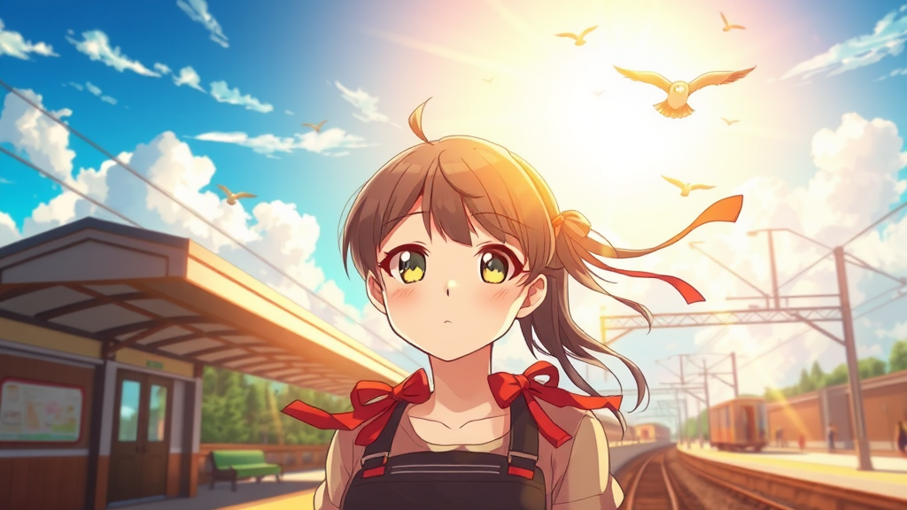 A highly detailed anime scene unfolds on a train station platform, capturing a pretty anime girl with a beautiful, expressive face framed by vibrant red ribbons. The setting exudes warmth as a golden sunlight bathes the scene, casting playful shadows. Above, a vast azure sky stretches with fluffy clouds drifting lazily, conveying a sense of tranquility and openness. The atmosphere is imbued with a dreamy, soft focus, enhancing the bright, vivid colors that surround the girl. The scene is reminiscent of the evocative style of Makoto Shinkai, with subtle creative elements such as playful birds flitting about and a gentle breeze that tousles the girl's hair, adding layers of depth and emotion to the setting.