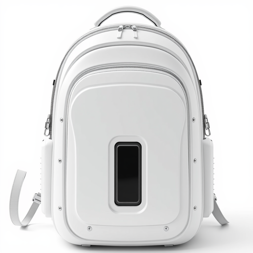 Futuristic sleek capsule-shaped backpack in pristine white, inspired by urban stormtrooper aesthetics, showcasing a clean and minimalist product design in 4K. Integrates intricate and detailed textures influenced by Dieter Rams and Apple, featuring a full-view hardcase structure with subtle metallic accents and contemporary ergonomic features, set against a pure white background.