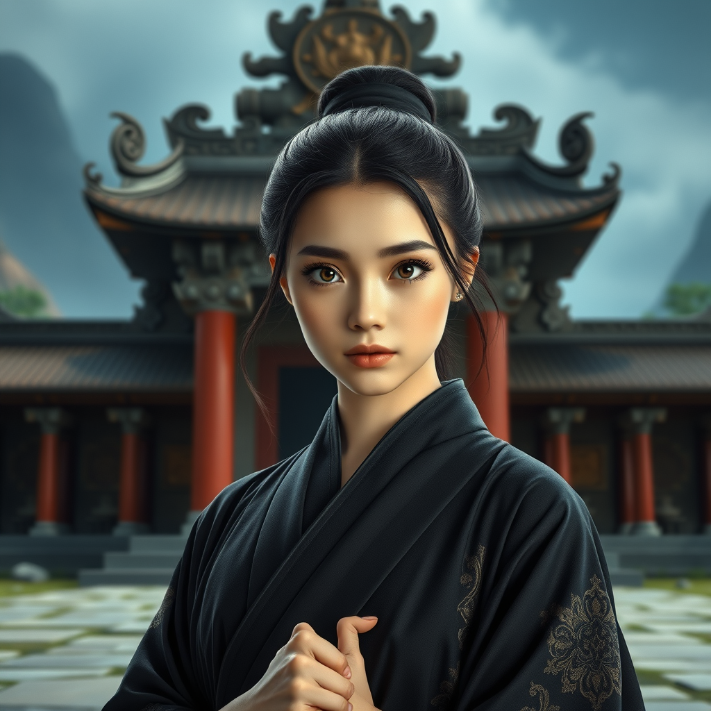 A young woman dressed in elaborate dark robes stands confidently in front of an ancient temple, her eyes perfectly symmetrical and expressive. The scene is illuminated with dramatic lighting that highlights the intricate details of her attire and the temple's architecture. Captured with razor-sharp focus, the image exudes hyperrealism, as if brought to life with advanced raytracing and physics-based rendering techniques. Her dynamic pose adds a sense of movement and vitality, blending the realms of fine art and digital creation in a seamless fusion of photography and intricate digital painting, hinting at elements of CGI, anime, and 3D illustration.
