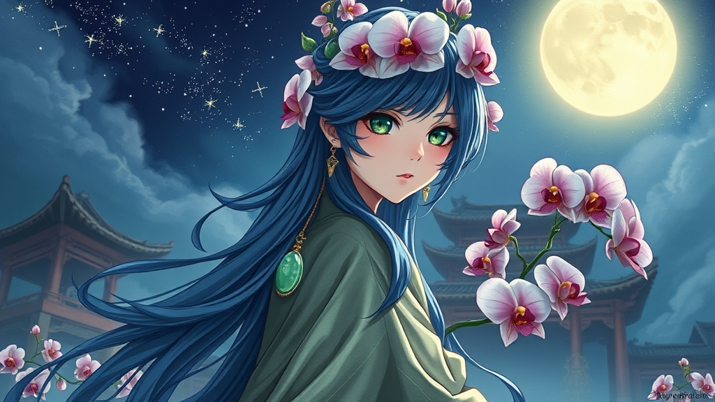 A mysterious anime sorcerer from the Tang dynasty adorned with an orchid hair accessory and a jade charm stands under the moonlit sky in an ancient temple. Their emerald green eyes reflect the allure of midnight blue hair, complemented by a celestial star ornament. The mystical landscape is reminiscent of Kay Nielsen's artwork, showcasing flowing robes that cascade elegantly. The figure looks directly at the camera, captured in a wide-angle portrait with enchanting lighting that resembles flickering starlight. Orchid blossoms burst around them like magical sparks, and the luminous scene is reminiscent of a thousand constellations, rendered in mixed media with an expressive style, capturing the mystique and serenity of this otherworldly moment.