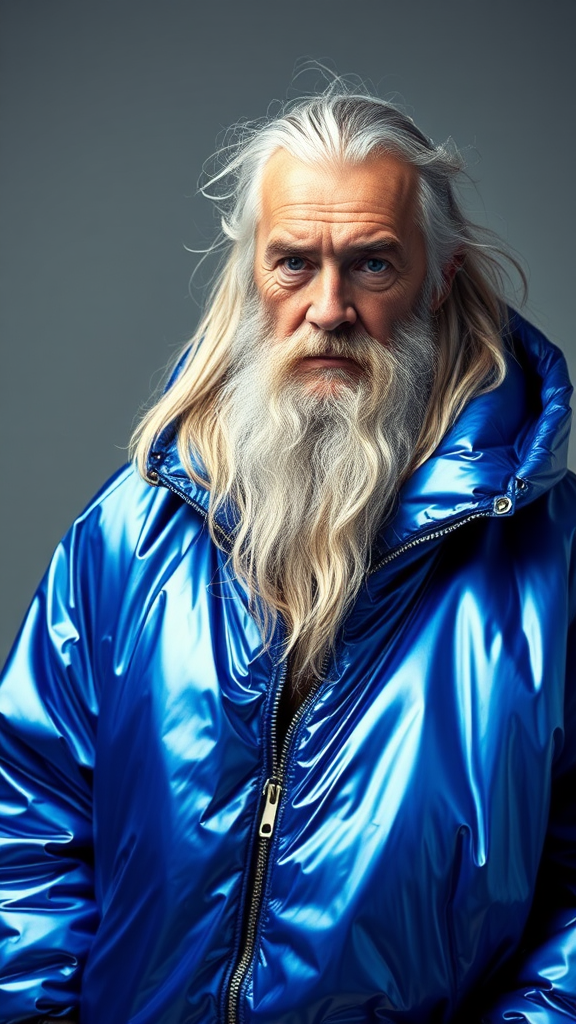 A well-lit fashion shoot portrait featuring Gandalf dressed in a striking metallic blue inflatable oversized jacket, collaboratively designed by Yeezy and Balenciaga. The image is in sharp focus, showcasing clear and intricate details with a cinematic and glamorous feel. Soft and indirect lighting enhance the symmetrical composition, evoking a Vogue editorial aesthetic. The scene captures Gandalf's full figure, exuding a sense of innovative fashion with an air of timeless elegance. The distinct textures and reflections of the jacket complement Gandalf's wise and aged visage, set against a stylish and dynamic backdrop that symbolizes modern high couture.