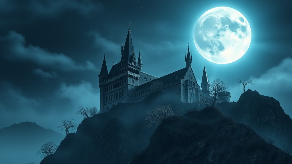 A towering gothic castle perched atop a rugged mountain, its dark spires piercing the night sky. The scene is illuminated by a full, ghostly moon that casts an ethereal glow over the landscape, enhancing the castle's imposing silhouette. The air is thick with a sense of wonder and foreboding, as the cold, magical light bathes the ancient stone in an otherworldly luminescence. The scene captures a high level of detail, from the intricate carvings on the castle's facade to the wild, windswept trees clinging to the mountain’s craggy surface. The overwhelming atmosphere evokes a haunting beauty, merging awe with a subtle chill.
