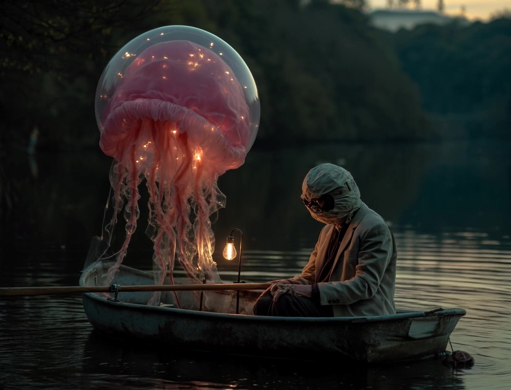As the evening deepens, a delicate pink jellyfish begins its ethereal ascent from the tranquil pond, its soft glow radiating with tiny sparkles that shimmer against the darkening sky. The water ripples gently around it, reflecting the magical light and creating a serene ambiance. In a small boat, a lone figure sits captivated, their gaze fixed on the wonder unfolding before them. The warm glow of a hanging lantern casts a comforting light, intertwining with the jellyfish's luminescence and enhancing the dreamlike atmosphere of the scene. It’s a moment suspended in time, where nature and magic collide, evoking deep feelings of peace and awe.