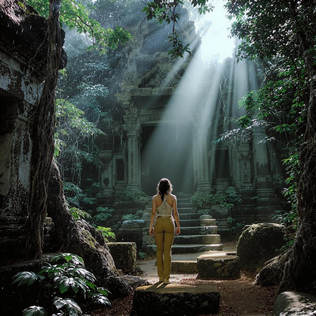 A captivating photo captures a female adventurer discovering an ancient temple ruin shrouded in the lush greenery of a dense 1980s jungle. The scene is enveloped in a volumetric atmosphere, with dappled sunlight filtering through dense foliage, casting intricate patterns on the ancient stone structures. The adventurer stands centered in the frame, showcasing breathtaking beauty and intricate detail, reminiscent of artists like Carne Griffiths and Conrad Roset. The vibrant and comprehensive cinematic quality of the image is enhanced by precise lineart, highlighting the meticulous craftsmanship of the temple's carvings. Despite the complexity and depth of the scene, the image retains a vivid clarity, focusing on the sense of wonder and discovery.