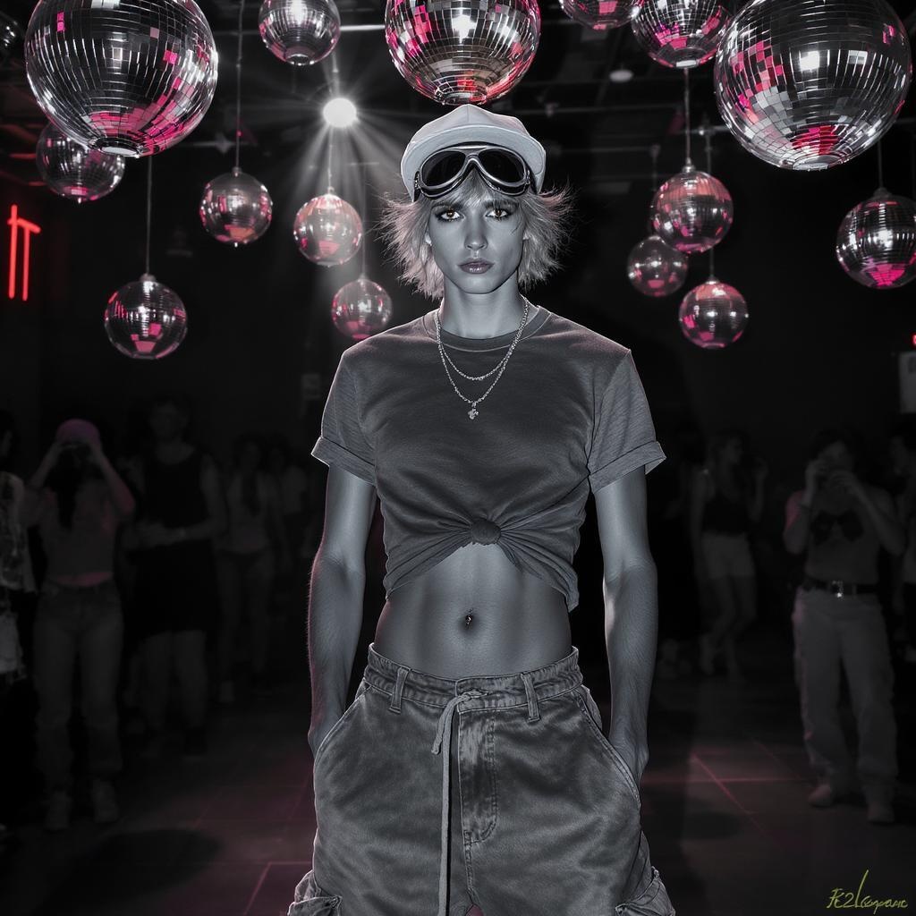 Disco-inspired dynamic young, slender, athletic individual with short, tousled hair, featuring intricate details. Wearing oversized pants and a fitted t-shirt, accessorized with goggles, a cap, and a midriff-baring outfit highlighting a bellybutton piercing. Posing fashionably as if captured with a DSLR camera, using an F/2.8 aperture and experiencing lens flare, suggesting a 5D capture at 16k Super-Resolution. The scene is vibrant and groovy, with a retro 70s flair, surrounded by shiny disco balls, neon lights, and a lively dance floor. It blends highly detailed minimalist and rustic elements in a monochrome, contemporary, simplistic manner, with a touch of minimal unrealistic aesthetics for a unique look.