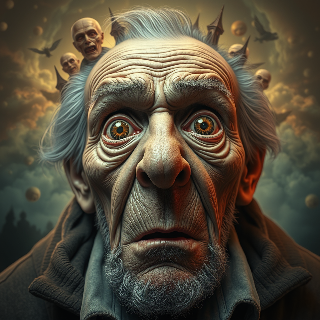Elderly, terrified grandfather with eyes wide in fear, enveloped by a nightmarish sky hallucination, invoking a blend of baroque maximalism and chibi style, crafted by Artificial Nightmares, with influences of Stanley Artgerm and Tim Burton. His face features intricate, sharp eyes, exhibiting extreme detail, organic textures, and dynamic expressions. The scene is photorealistic, ultra-realistic, and high definition, with a focus on intricate, crisp quality, capturing a vivid, surreal atmosphere.