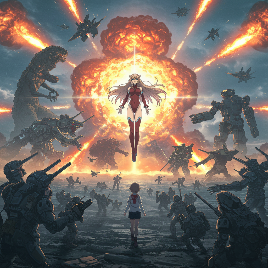 An awe-inspiring Anime Girl of immense power takes center stage, envisioned by the legendary talents of Hideaki Anno, Katsuhiro Otomo, and Rumiko Takahashi. In this cinematic masterpiece, which shattered box office records, she stands at the heart of the narrative. Surrounding her, a chaotic ballet unfolds between colossal monsters and formidable mech creatures locked in fierce combat. The sky is a canvas of fiery nuclear explosions, rendered in stunning, intricate detail. This 8k visual marvel weaves an epic story that captivates and mesmerizes, blending elements of science fiction and fantasy into a seamless and unforgettable experience.