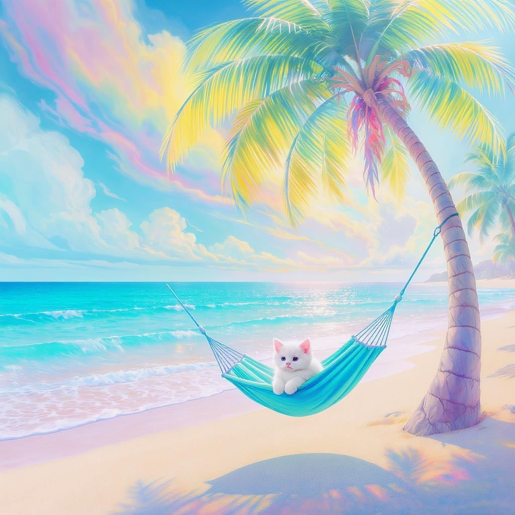 A tiny snow-white kitten rests on a swinging azure hammock beside a graceful palm tree, set against an abstract, dreamlike beach shimmering with sunlight. The scene is bathed in rainbow-hued skies, creating an awe-inspiring and ethereal atmosphere. The air seems to dance with light, casting semi-transparent reflections across the sand, as soft pastel colors blend seamlessly overhead, encapsulating the serenity of this imaginative coastal paradise.