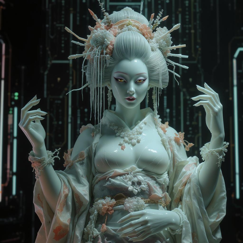 Ultra detailed marble and jade sculpture of a geisha, crafted in mdjrny-v4 style. The piece embodies hyperrealism with breathtaking and ultra-realistic features. Set against a cyber-inspired background, the sculpture is illuminated with cinematic lighting, creating a highly detailed and stunning environment. Captured in a wide-angle portrait photograph using a Hasselblad H3DII, the image exudes extreme detail, depth of field, and the meticulous precision of a 3D octane render. Despite its intricate beauty, the sculpture includes intentional artistic quirks, such as unconventional anatomy with extra arms and fingers, alongside blurry and fuzzy elements, giving it a disfigured and mutated aesthetic. Faces appear slightly out of frame or cloned, resulting in a mesmerizing yet surreal visual experience.