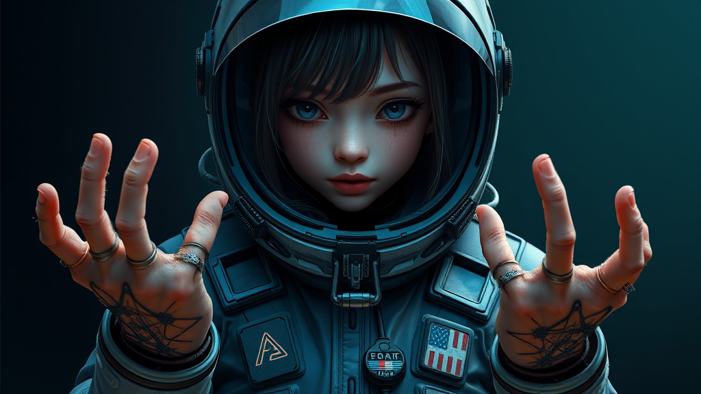 A stunning hyper-realistic painting of a captivating girl in an EVA plugsuit, infused with intricate details, inspired by anime and the works of Greg Rutkowski, currently trending on ArtStation. The piece features CGI elements, resembling a 3D doll, using octane rendering. It purposefully incorporates elements of distorted anatomy, with extra arms and fingers, emphasizing blurry, fuzzy textures. The hands are intentionally poorly drawn, contributing to a disfigured and mutated appearance with tiling and deformed elements.