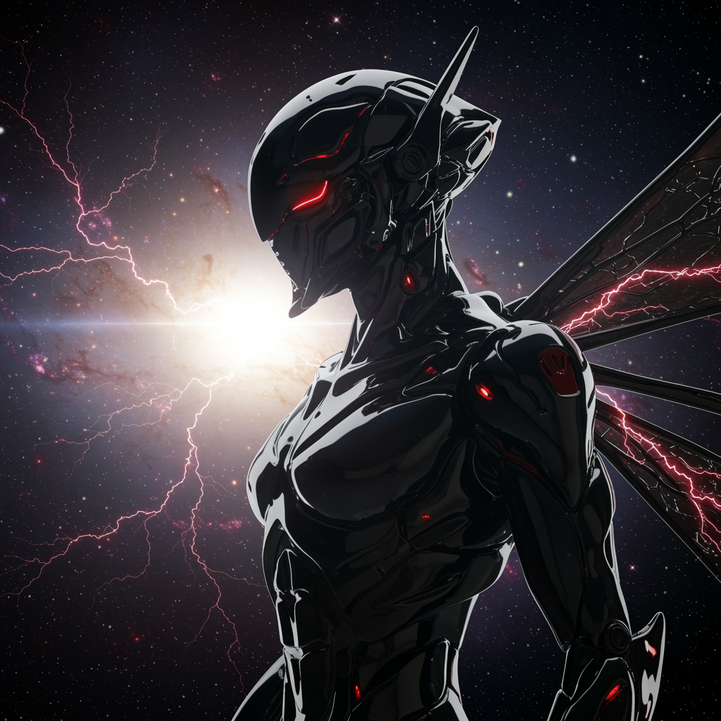 Portrait close-up of an ultra-detailed, streamlined Sci-fi mech with a slender form viewed in three quarters. The glossy black mech exudes an insectoid aesthetic, featuring reflective surfaces and intricate details. It possesses Sci-fi insectoid wings and follows an art style reminiscent of Tsutomu Nihei and Akira. Bright quasar light illuminates the scene, set against a dramatic outer space background. The composition combines three-dimensional graphics with anime art and manga drawing elements, enriched by cosmic starlight and a galaxy's vibrant colors. Plasma rays dance across the image, captured in hyper-realistic 8k UHD quality as if shot with a digital Hasselblad H4D 200MS camera equipped with a Mitakon Speedmaster 65mm f/1 lens.